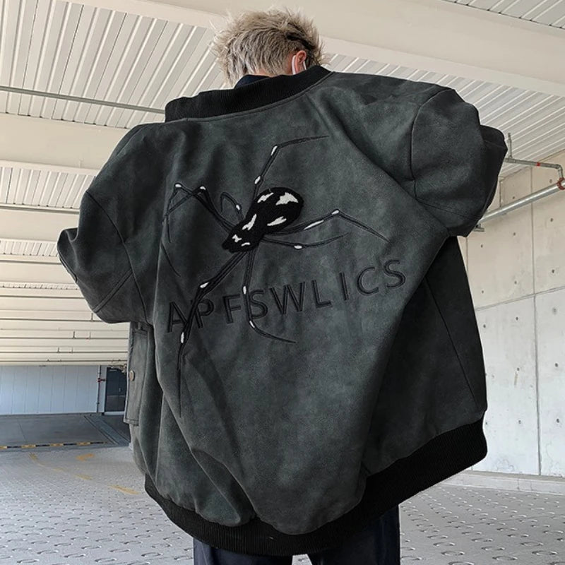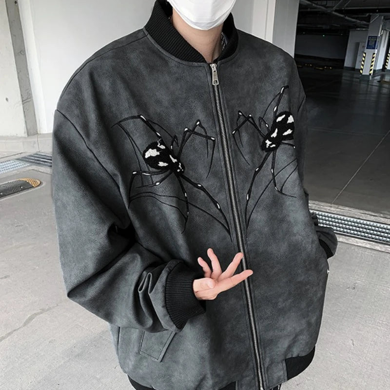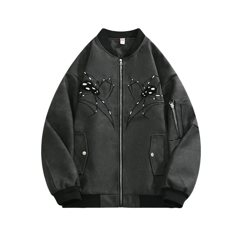 Zwarte bomberjack met opvallende geborduurde spinnen op de borst, wat een unieke en edgy uitstraling geeft.