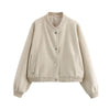 Deze crèmekleurige bomberjack heeft een elegante en minimalistische uitstraling met knoopsluiting en een rechte pasvorm. De geribde boorden en zachte stof maken hem ideaal voor een casual en moderne look in de herfst en winter.