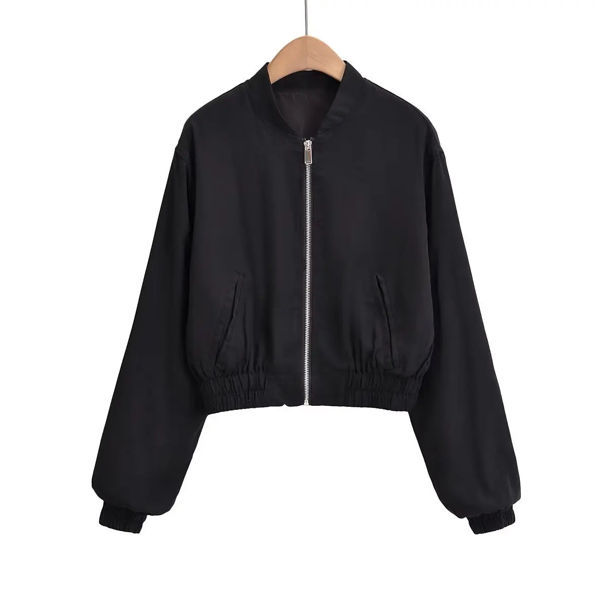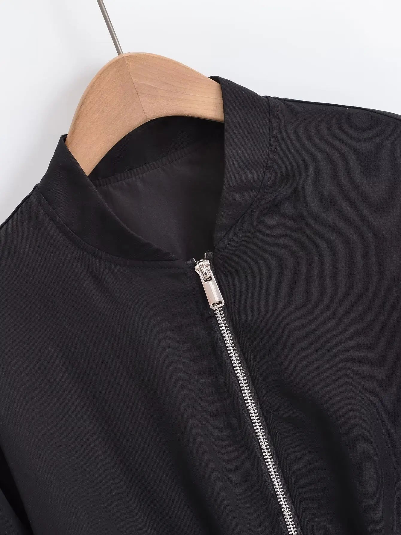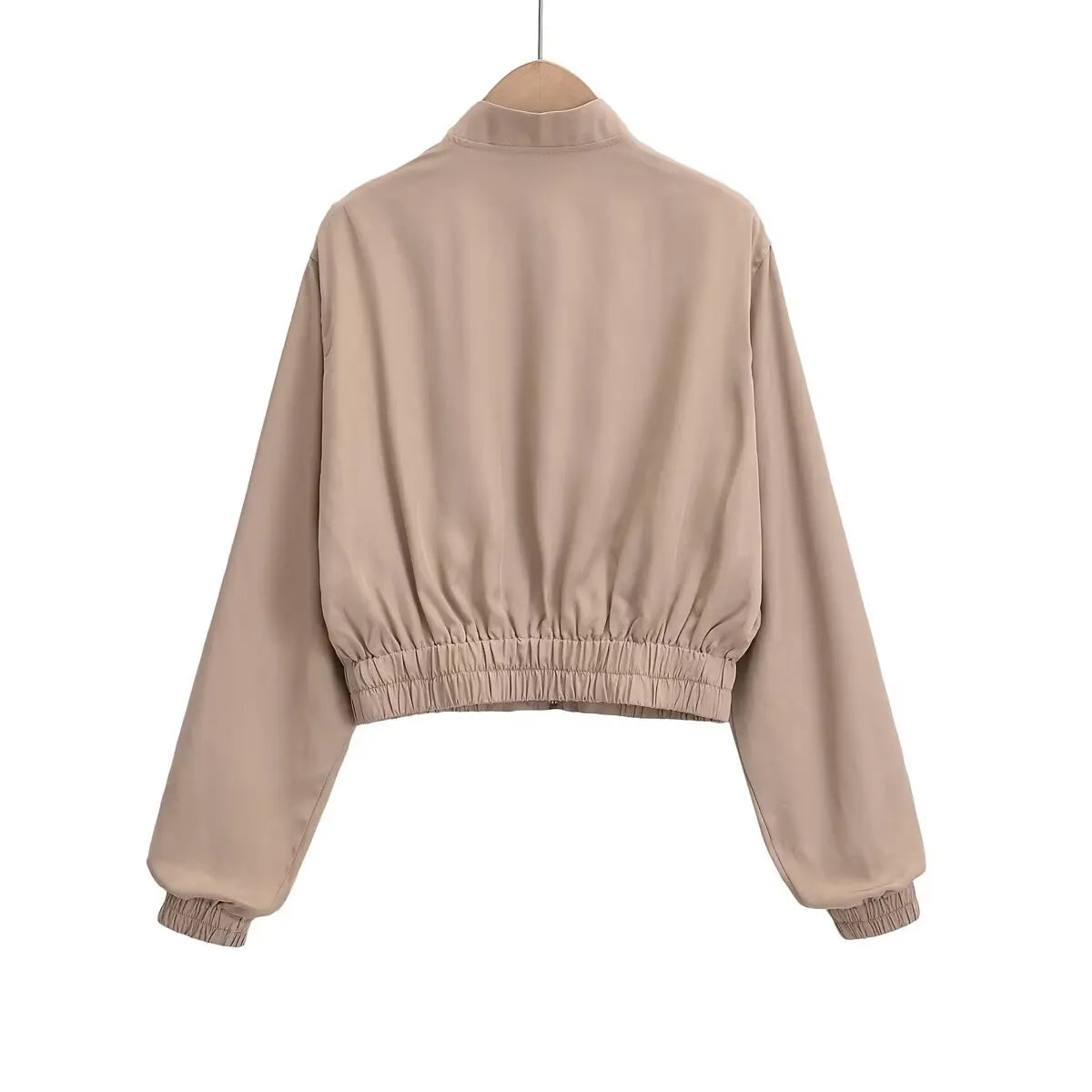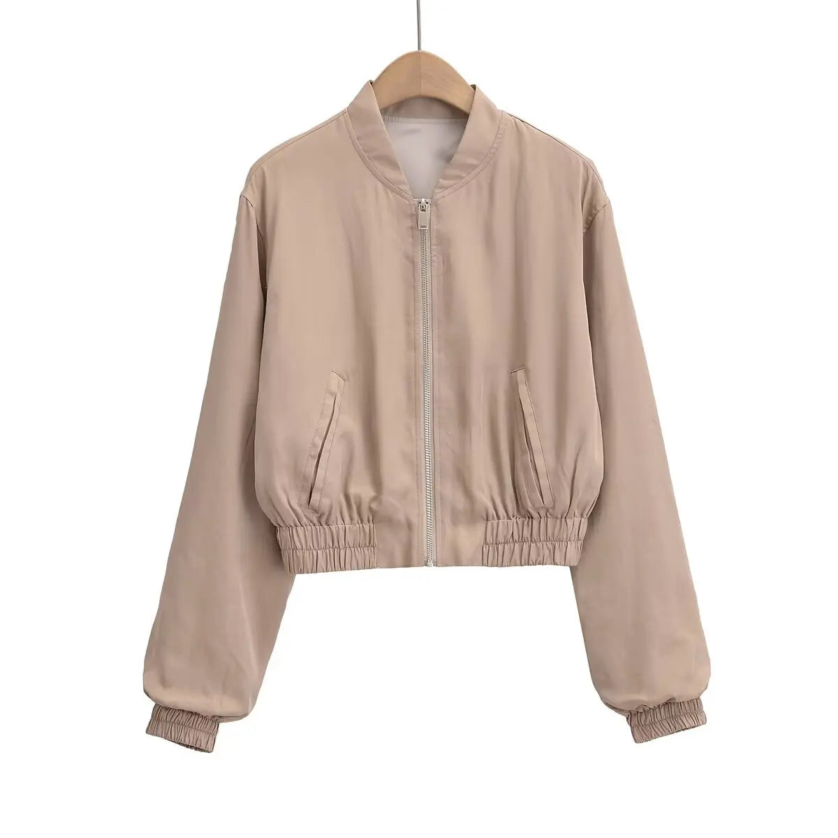 Deze minimalistische bomberjack is verkrijgbaar in zwart en beige en heeft een eenvoudige ritssluiting voor een strakke, casual look. De elastische zoom en manchetten zorgen voor een comfortabele pasvorm en een moderne uitstraling.