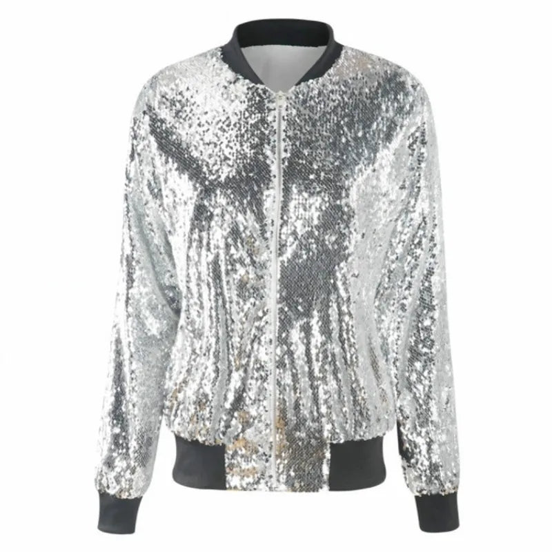 Deze pailletten bomberjas is een echte showstopper. Het glanzende oppervlak vangt het licht bij elke beweging en zorgt voor een feestelijke en opvallende look. Perfect voor festivals, feestjes of om een basic outfit extra flair te geven. Verkrijgbaar in groen-blauw, zilver, goud en zwart.
