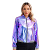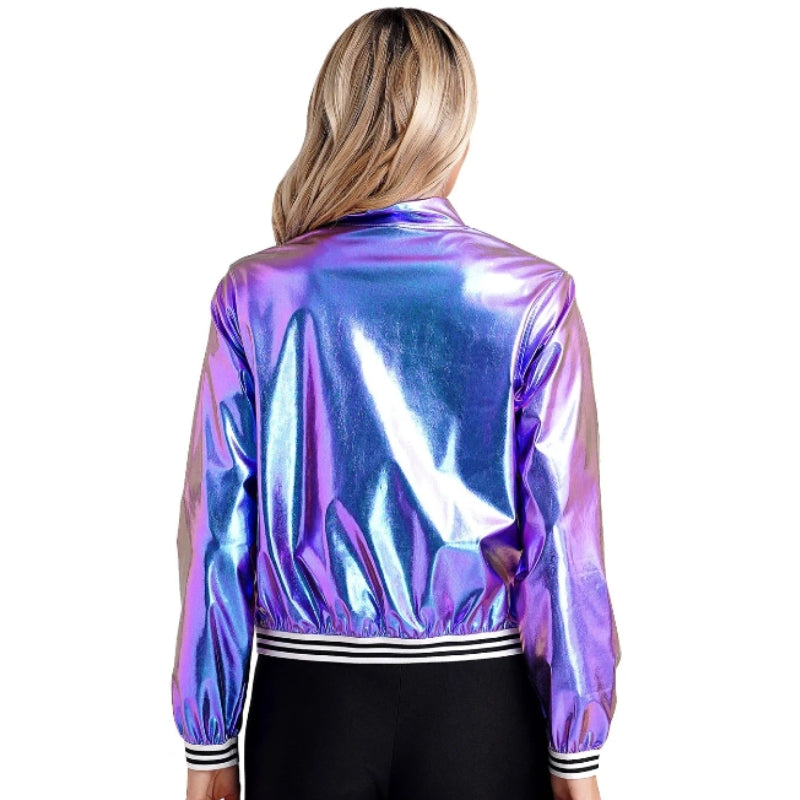 Deze holografische bomberjas is een echte blikvanger dankzij de regenboogglans die van kleur verandert bij elke beweging. De korte pasvorm en de gestreepte boorden geven de jas een sportieve look, terwijl de rits aan de voorkant hem praktisch en makkelijk draagbaar maakt.