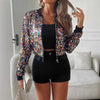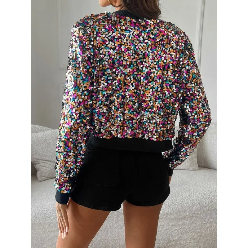 Deze cropped bomberjack is volledig bedekt met kleurrijke pailletten en is dé statement piece voor een feestelijke look. Het korte model en de zwarte boorden zorgen voor een speelse, glam vibe die perfect is voor party's en festivals.