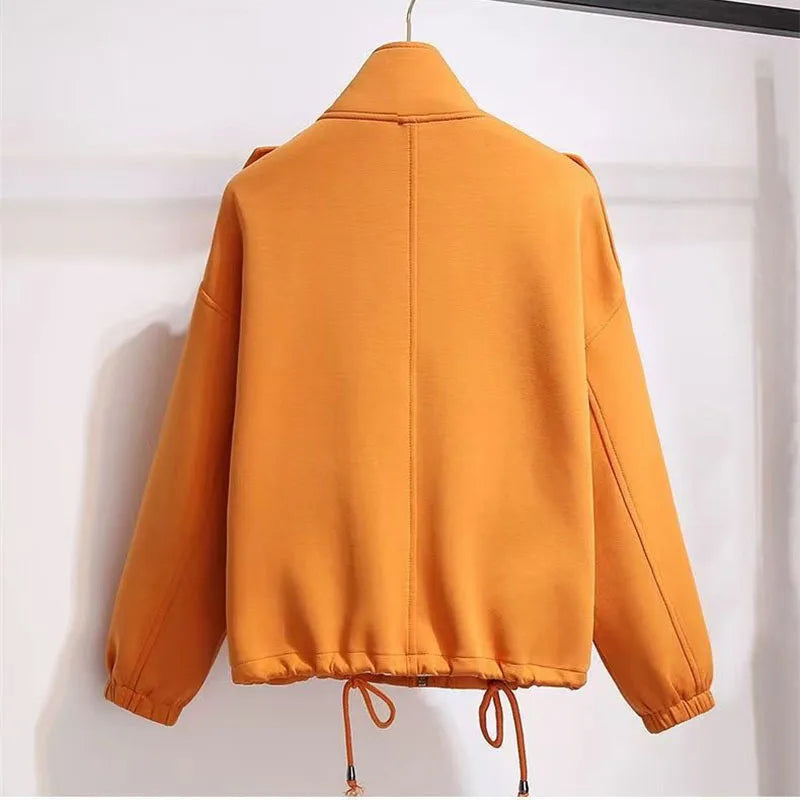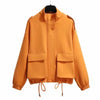 Deze oranje jas geeft elke outfit een frisse en moderne look. De grote voorzakken en het trekkoord aan de zoom zorgen voor een casual, praktische uitstraling. De hoge kraag en de rits met extra knoopsluiting maken de jas perfect voor winderige dagen.
