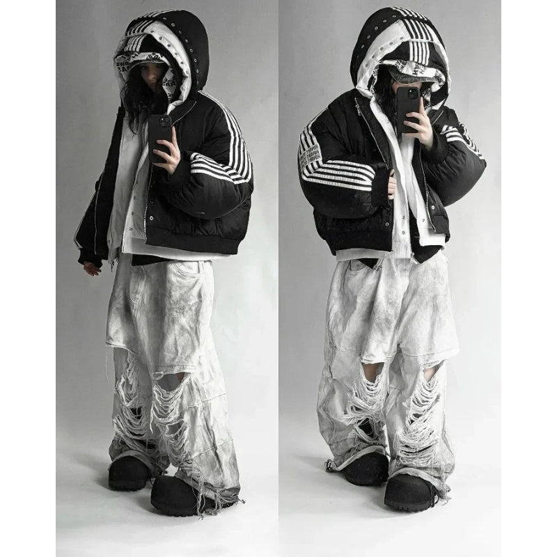 Deze zwarte bomberjack met capuchon is een echte streetwear must-have. De opvallende witte strepen op de mouwen en de grote graffiti-print “Midwest Trash” op de rug geven de jas een edgy, urban uitstraling perfect om een statement te maken.