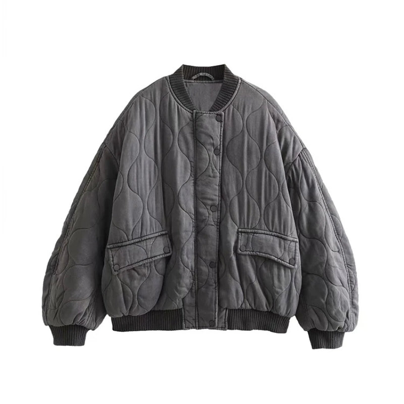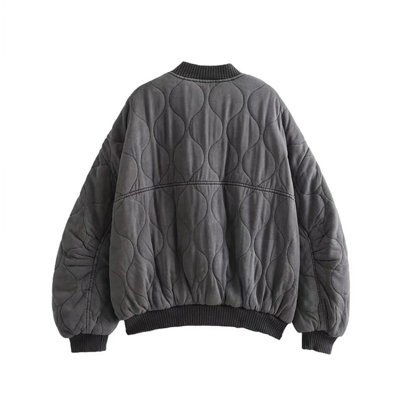 Deze grijze quilted bomberjas is ideaal voor frisse dagen. Het gewatteerde design met golvende stiksels geeft een moderne en trendy uitstraling. De drukknopen aan de voorkant en de brede geribde boorden zorgen voor een comfortabele pasvorm en een stoere look.