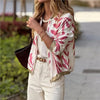 Deze bomber met opvallende rode botanische print op een crèmekleurige achtergrond is een echte blikvanger. De glanzende gouden boorden geven een vleugje luxe en maken dit jasje perfect om elke outfit een frisse, stijlvolle upgrade te geven.