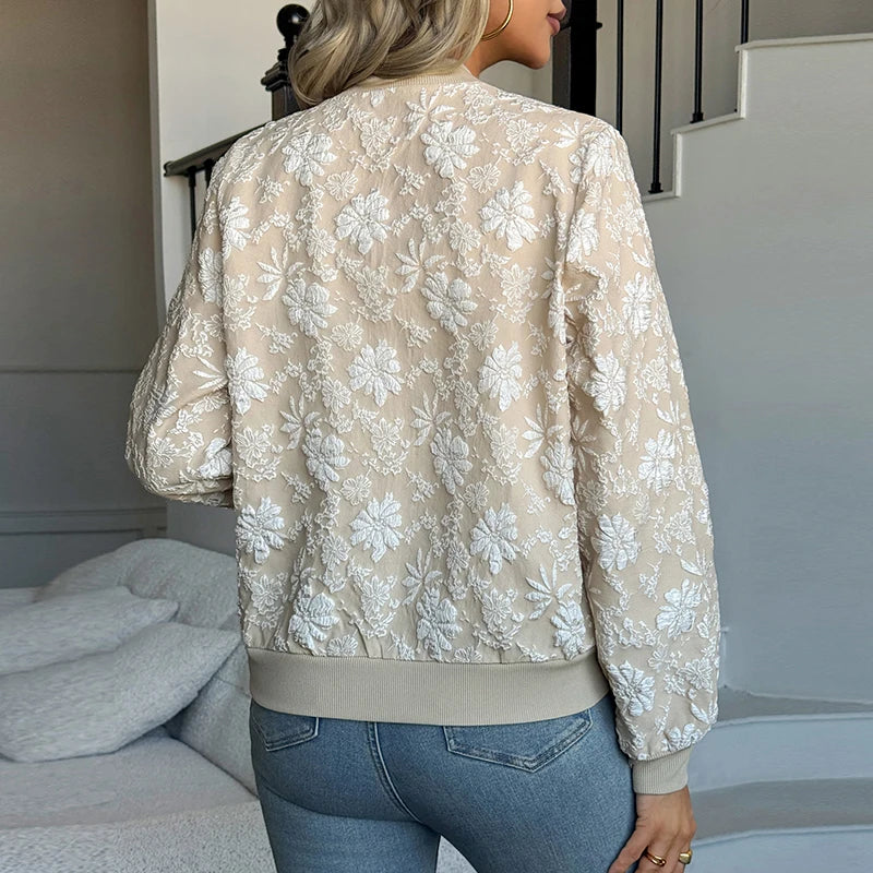 Deze beige bomberjas met witte bloemenkant is een echte eyecatcher. De transparante mesh-stof met geborduurde bloemen geeft de jas een elegante en vrouwelijke uitstraling, perfect om een simpele outfit net dat beetje extra te geven.