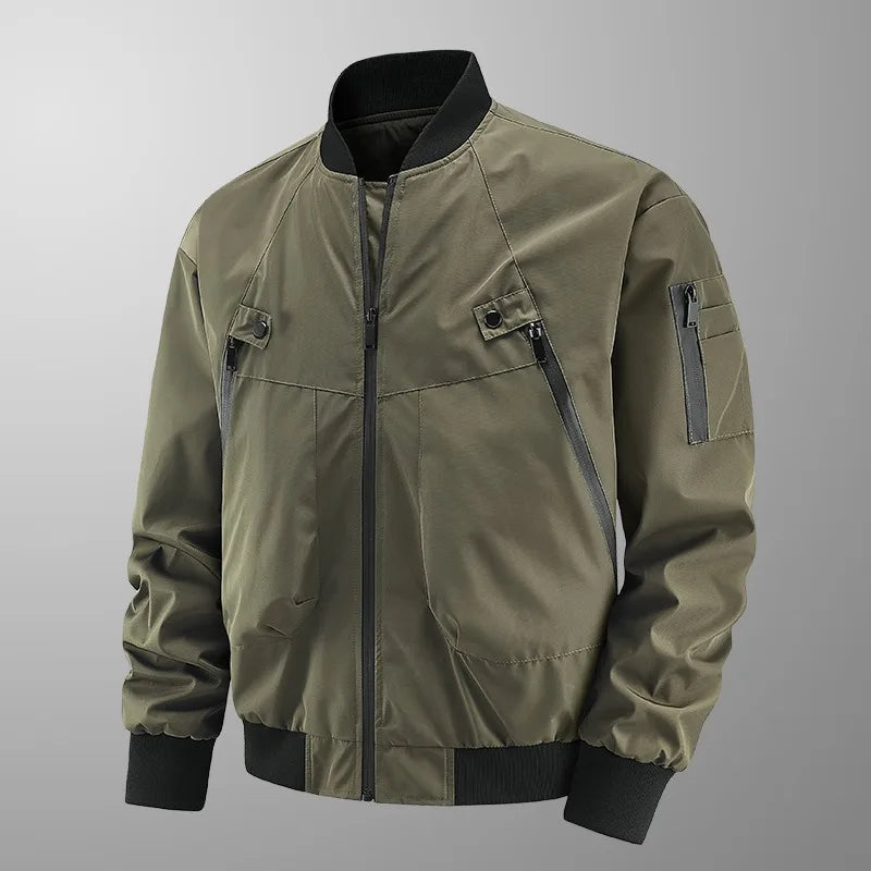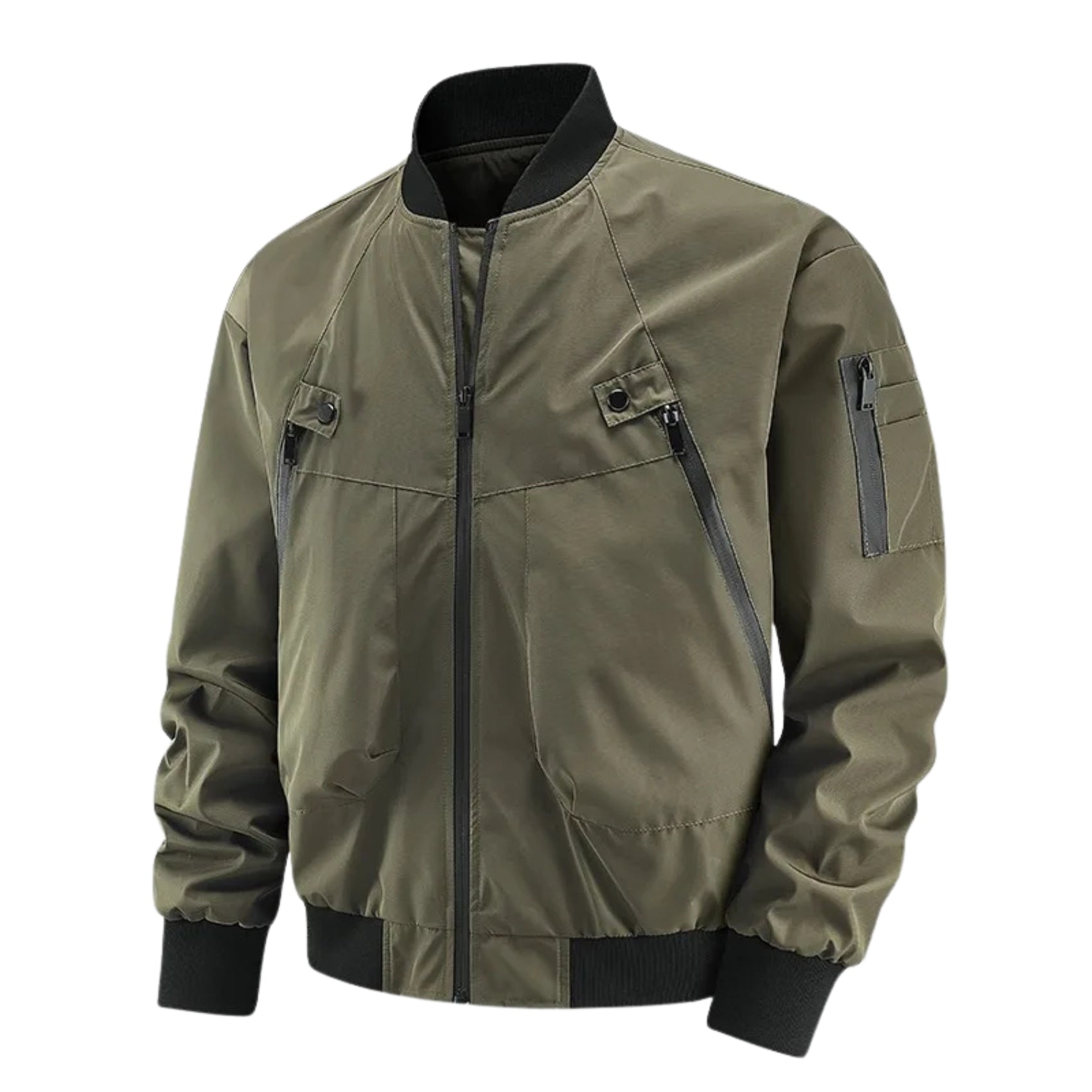 Voeg een stoere touch toe aan je outfit met deze kaki bomberjack. De diagonale ritsdetails op de borst en de zak op de mouw geven de jas een utility look, terwijl de elastische boorden zorgen voor een comfortabele pasvorm. Perfect voor het voorjaar en de herfst.