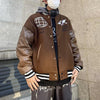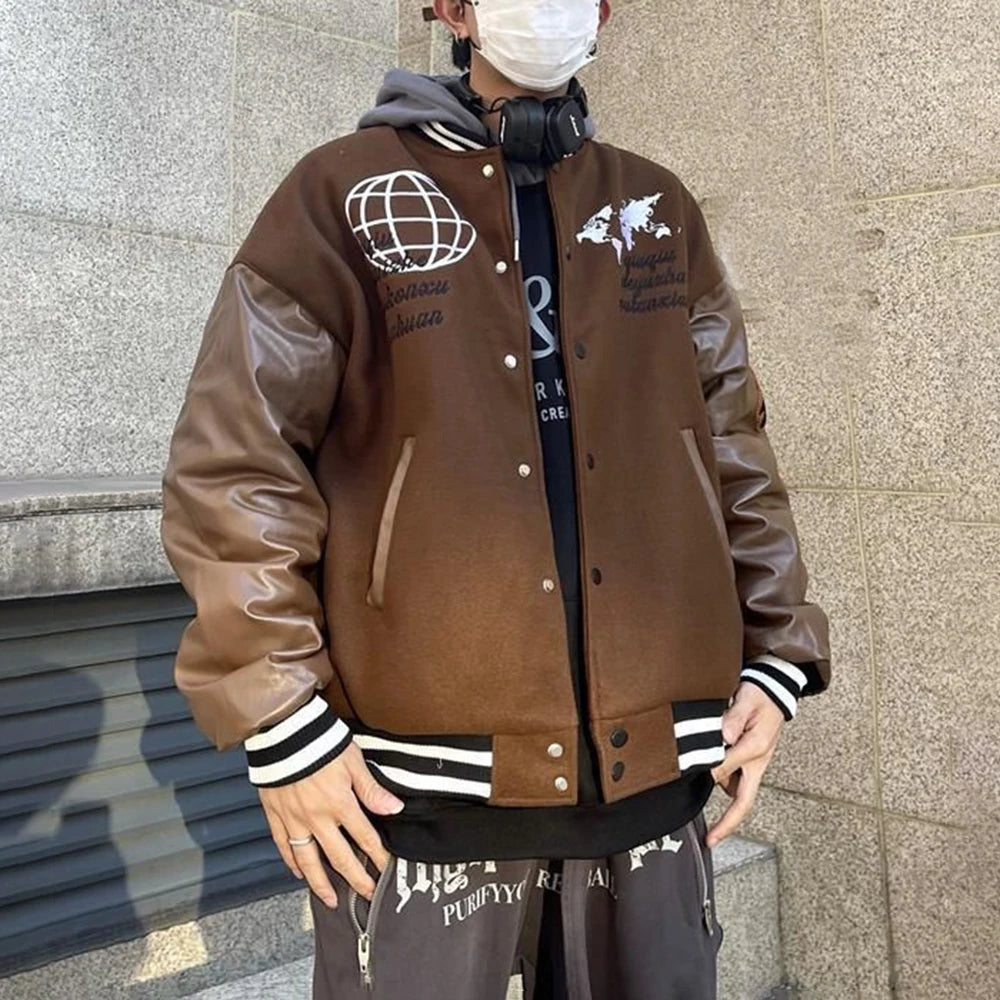 Bruine varsity bomberjack met contrasterende leren mouwen en opvallende prints op de borst, waaronder een wereldbol en een kaartmotief. De gestreepte boorden en drukknopen geven een klassieke college look, terwijl de losse pasvorm zorgt voor een casual en comfortabele stijl.