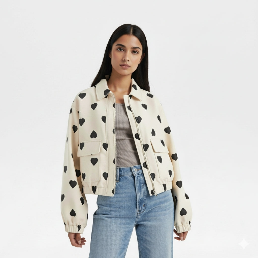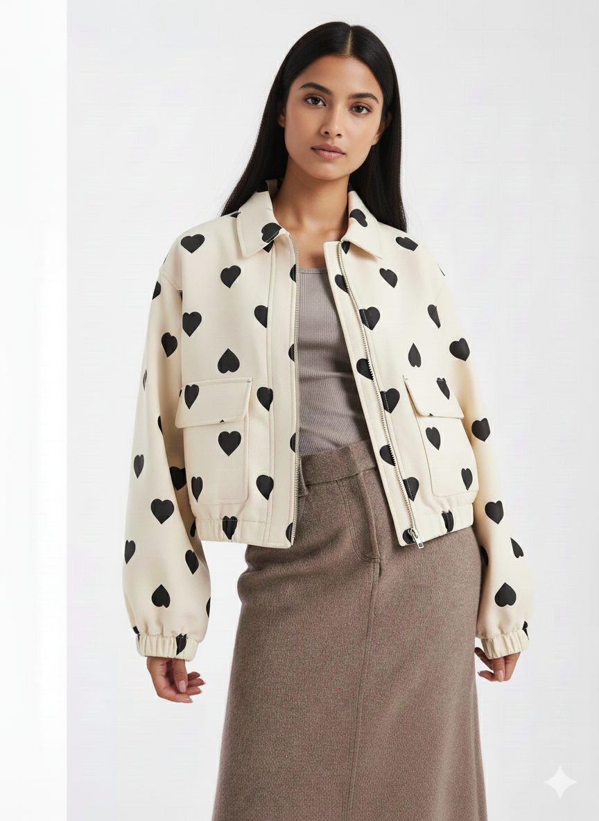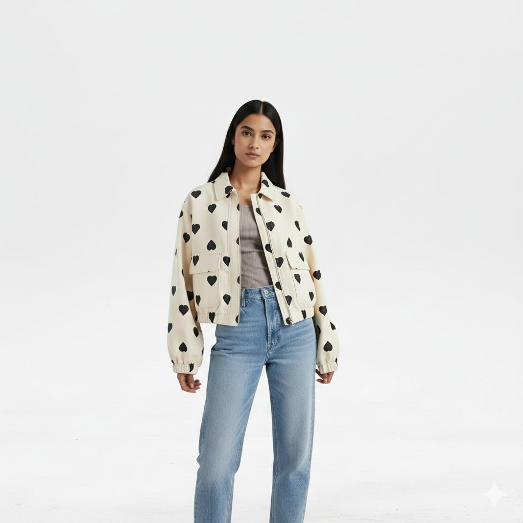 Deze bomber is een speelse en stijlvolle keuze dankzij de zwarte hartjesprint op een crèmekleurige achtergrond. De grote zakken en elastische boorden geven hem een casual streetwear vibe, ideaal om een basic outfit op te vrolijken.