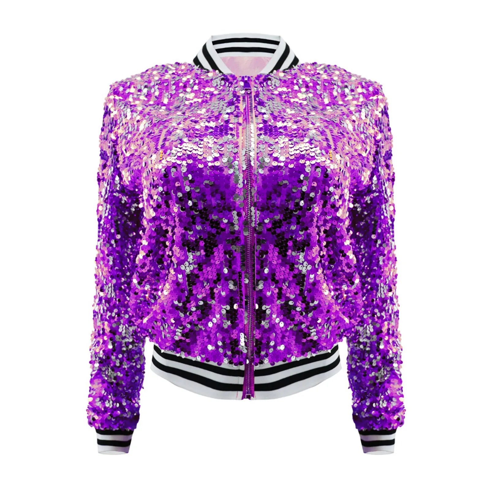 Deze paarse pailletten bomberjas geeft je outfit direct een kleurrijke en sprankelende touch. De schitterende pailletten creëren een feestelijke, opvallende look die perfect is voor festivals, avondjes uit of andere speciale momenten.