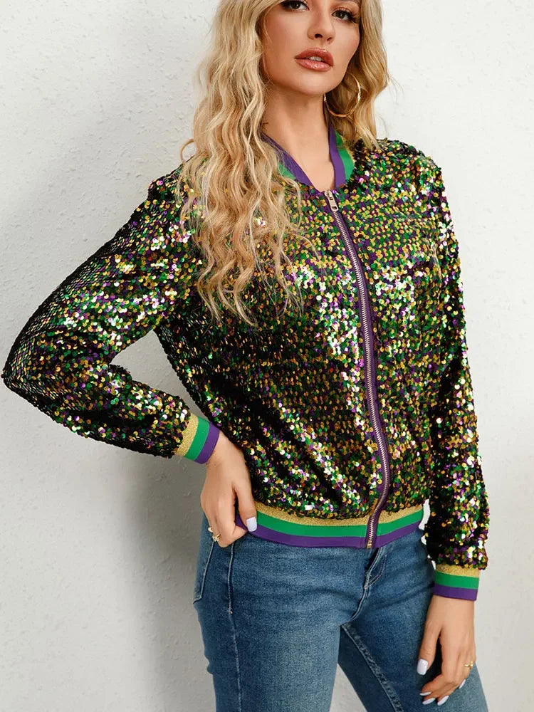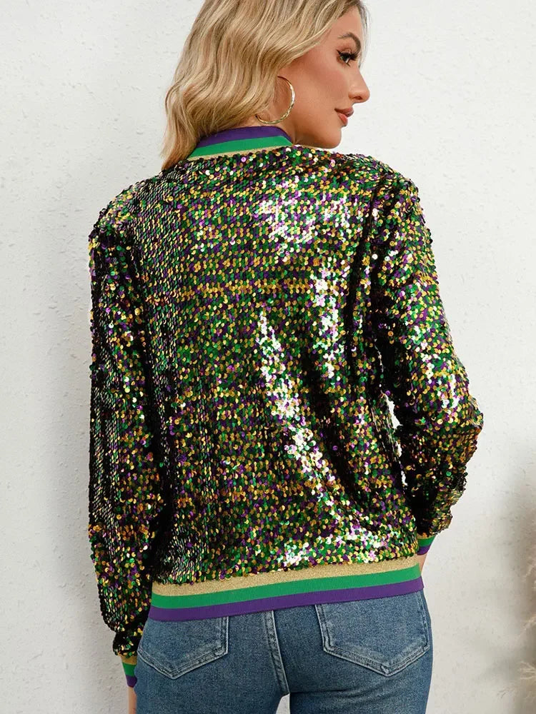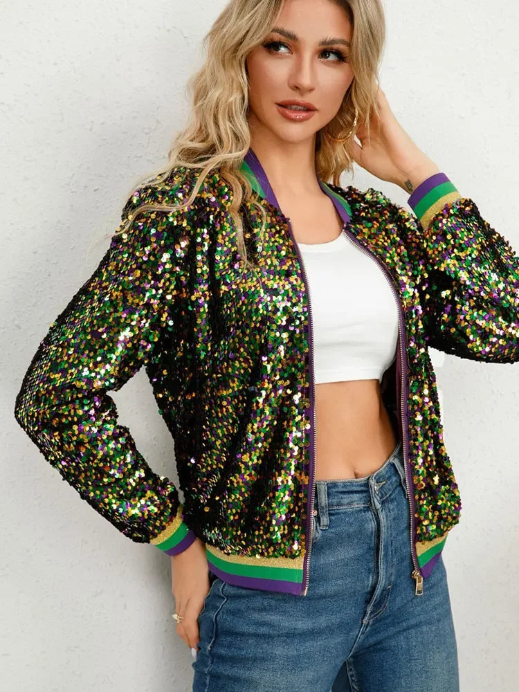 Deze pailletten bomber is gemaakt om te schitteren. De glanzende groene, paarse en gouden pailletten vangen het licht bij elke beweging, terwijl de geribde boorden met kleurrijke strepen een speelse en sportieve touch geven. Ideaal voor feestjes, festivals en opvallende looks.