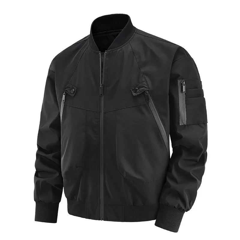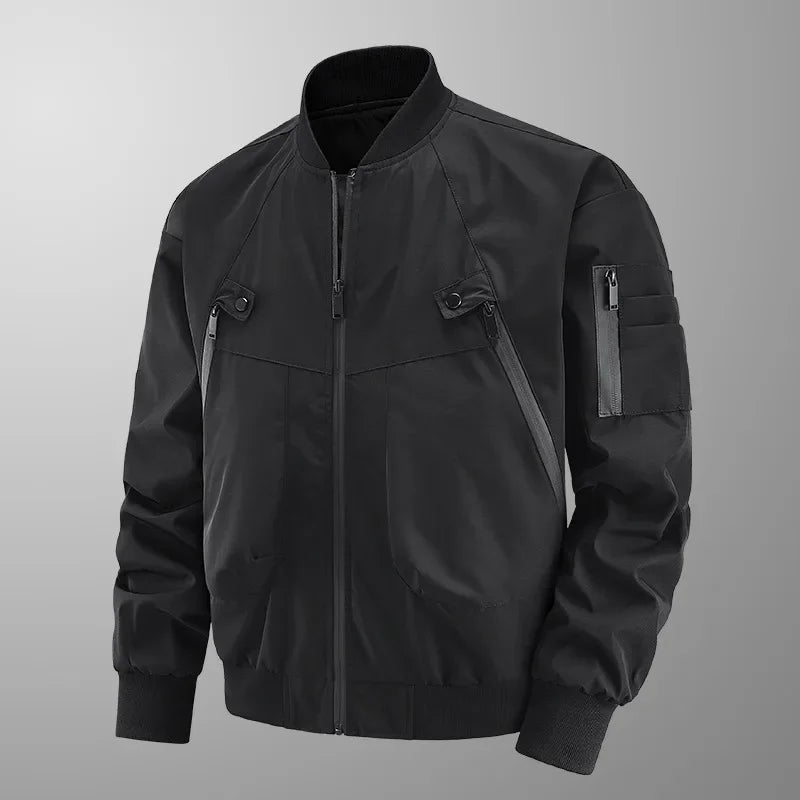 Geef je outfit een moderne en stoere uitstraling met deze zwarte bomberjack. De unieke borstdetails en de ritszak op de mouw zorgen voor een eigentijdse look, terwijl de elastische boorden zorgen voor een comfortabele pasvorm. Ideaal voor het voorjaar en de herfst.