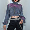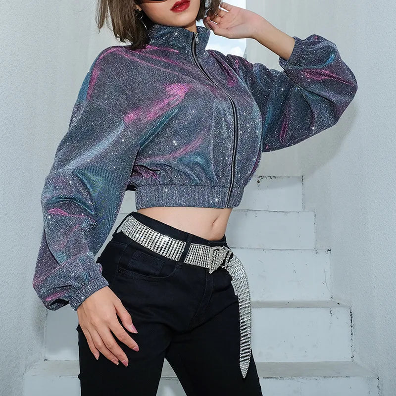 Deze glitter bomber is een echte showstopper. De iriserende paarse en blauwe glans geeft een futuristische look, terwijl de korte, elastische snit je taille accentueert. Perfect voor feestjes, festivals en avonden waarop je wil schitteren.